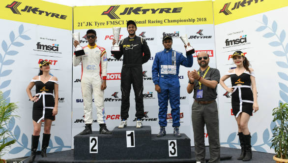 The 21st JK Tyre FMSCI National Racing Championships' Round 2 Euro JK 18 winners: Ashwin Datta (C), Nayan Chatterjee(R) and Karthik Tharani S(L)