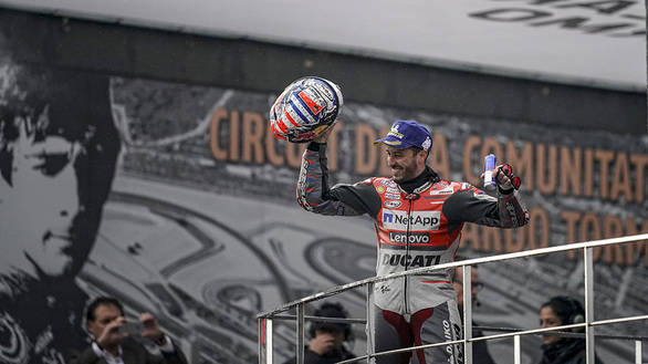 Rins started on pole, followed by Dovizioso in second and Rossi in third, while Pedrosa started fourth. Dovizioso was quick to pass Rins again in the second lap. Rossi's Yamaha seemed to have some trouble catching the duo in front of him but eventually he did pass Rins, while Espargaro trailed the three of them with Pedrosa hot on heels. Intriguingly, the rains had stopped when the race was restarted there was lots of water on track, especially at the apexes when the safety car was out on track prior to the restart. But barely minutes after the restart the rain was back, with dark clouds looming large over the circuit. Rossi tried a little too hard to catch race leader Dovizioso and crashed out in the process with just a couple of laps to go. Rossi did rejoin but had no chance at the podium. By the end of the race Dovizioso had pulled a solid, four second lead over second placed Rins, while Espargaro moved up to P3, bringing the silverware home in third. Ducati's wild card entrant Michele Pirro finished fourth, while Pedrosa finished a credible fifth behind him, his team applauding him as he came back into pits, one last time.