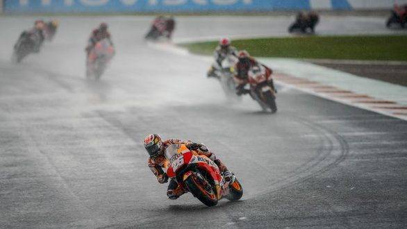 Pol's brother Aleix wasn't as lucky though and crashed out on his factory Aprilia, followed by the Alma Pramac Racing Ducati of Australian rider Jack Miller. Franco Morbidelli was out soon too, while running in fifth place, his best run in MotoGP yet. Even as the rain pounded down, Rossi and Dovizioso both caught up with Rins and passed him rather easily when he ran wide at turn 11. Taking the lead, Dovizioso raised his hand after crossing the start line on lap 14 following which the race was red flagged. As the riders had covered less than three-quarters of the total race distance, the race was scheduled for a restart at 3pm, local time, with the pitlane being opened for 60 seconds for the 16 riders who were classified at the time of the first race session being red flagged.