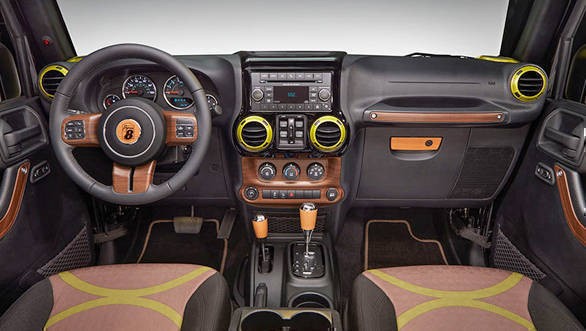 The interior of the Jeep Wrangler RoadM8 takes inspiration from the furnishings of the new Super 8 hotel rooms