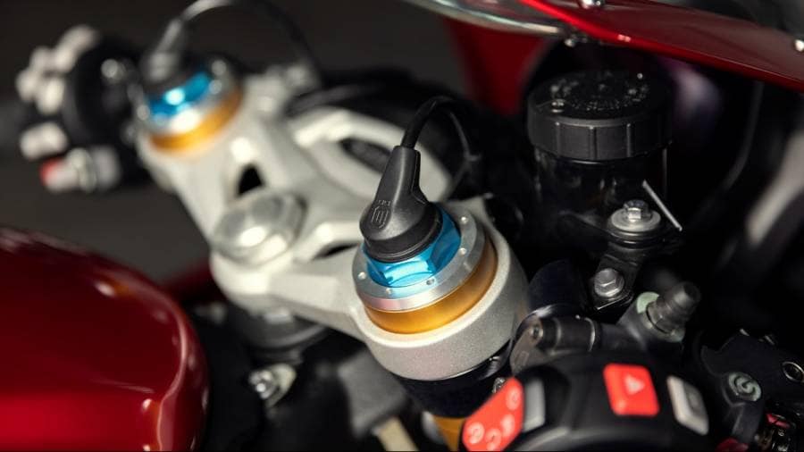Behind the wind deflector of the semi-faired bike sits a 5-inch TFT dash with Bluetooth connectivity. There are four riding modes to choose from, Rain, Road, Sport, Track, as well as a customisable mode with each mode comprising variations in throttle and suspension maps as well as levels of intervention of ABS and traction control. Additional ride-enhancing technology on the bike includes full keyless system, illuminated switch cubes and fully adjustable cruise control.