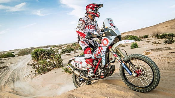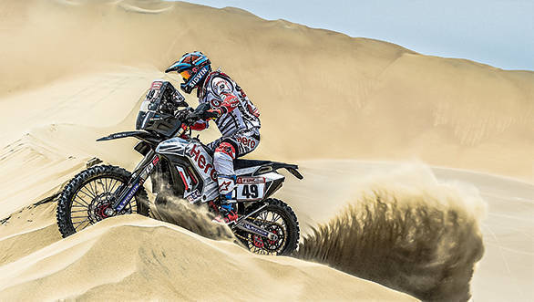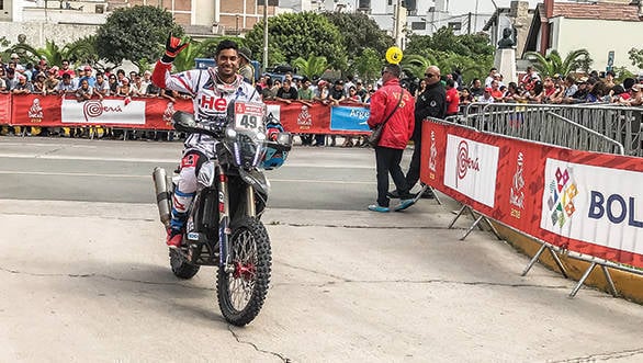 The Dakar is like your whole life compressed into two short weeks. There are highs, lows, and everything in between - and that makes it very, very intense. Imagine my surprise, then, to see CS Santosh wandering around the bivouac with a smile on his face after the first stage that led from Lima to Pisco. He's got good reason to smile too, since he's managed to end the stage 13th. It's given him a certain amount of confidence - the knowledge that he has what it takes to run up there with the fast guys at the head of the pack. And he's also managed to check a couple of things off his bucket list, including appearing on television. The Dakar TV crew had followed Santosh and Nacho in the dunes.