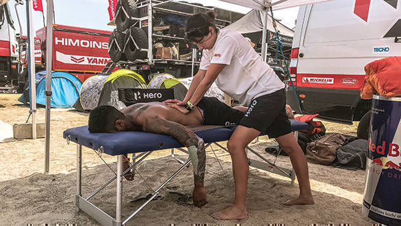Clearly Santosh works some magic with those coloured markers, poring over his roadbook for a couple of hours. He ends the second stage of the rally, within the dunes of Pisco, in 29th position. When we see him after the stage, he's being given a massage by the team physiotherapist. It's a move Hero MotoSports has made to ensure that any tiny issues that their riders develop over the course of a long day of riding, can be sorted out.