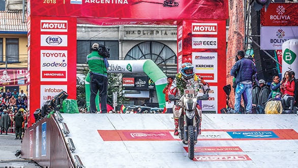 In those moments after he cartwheeled through the air and found himself sitting on the ground, Santosh says he thought he'd broken his leg. "I couldn't feel my leg, I thought it was the adrenaline that was preventing me from feeling the pain in the initial shock." It was then that he began wondering whether he ought to just pack up and go back home. "I sat there for 10 or 15 minutes thinking someone would come pick the bike up. But nobody came. Then I thought okay, I've got to get up and finish the Dakar." And so he got up, and rode till the end of the stage. He'd lost a lot of time, but he still finished 51st. It was an improvement on his performance the previous stage where he'd only finished 56th. And it certainly was a huge improvement over that disastrous third stage where he ran out of fuel around 20km to the finish line and had to wait for the slower riders at the back of the pack to come by and help him out. But the Dakar wouldn't be the Dakar without a few unexpected twists and turns along the way.