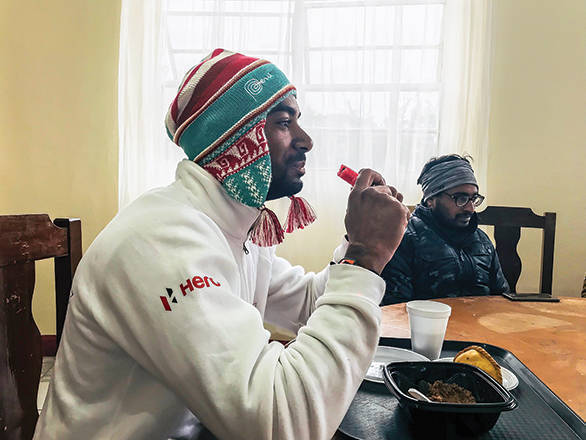 The cold at La Paz, Bolivia is being battled by a slice of watermelon, some hot tea, an empanada and some pasta