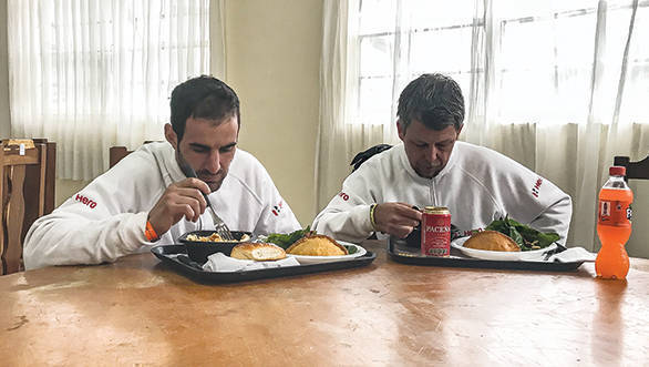 The minute he gets off the motorcycle at the bivouac, a couple of TV cameras are upon him. He does his interviews as best as he can, but he's soaked through to the bone. The team tells us that he isn't feeling very well, and he's frozen through. I'm sure it's a relief, then, to have the luxury of a hot shower, a good meal, and a comfortable bed in a proper hotel room for the night - rest day at La Paz is upon the Dakar, after all. Before he manages to leave to the hotel though, he's wolfing down some lunch and talking about his performance in the rally thus far. Even with his spectacular performances in the Dakar, Mena comes off as incredibly humble. He tells me that since the sixth stage of the rally was full of mud, and full of rain, he's tried to ride as safe as he could, and he's pleased that there's one day less to the finish at Cordoba. "I'm happy with my rhythm, but I need to learn a lot. Some days I commit some mistakes," he says. Mistakes that he's disappointed with. But there are those other stages where he's "surprised with my level". Mena, who is still coming to terms with competing in rally raids says he is "Scared to drive fast - I need to see before, how is the jumps, or how is the corners, or how is the piste". After all, reading the terrain ahead of you is the only way to avoid crashes. "I have respect to drive fast," he clarifies later.