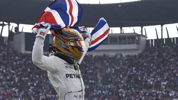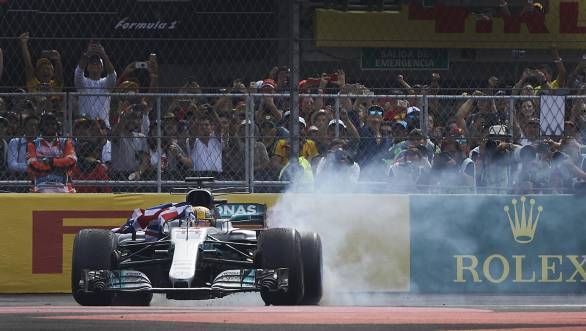 Lewis Hamilton celebrates his fourth F1 championship title at the 2017 Mexican Grand Prix