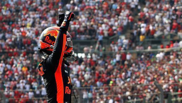 Max Verstappen celebrates winning the Mexican Grand Prix, his third career F1 victory