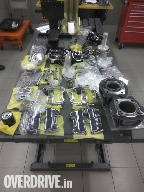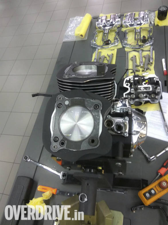 John McEaneny, the Harley-Davidson service chief for Asia, was by our side, demonstrating the steps to put the engine back together. I have to say, it's quite a sight to see the various engine parts on the table.