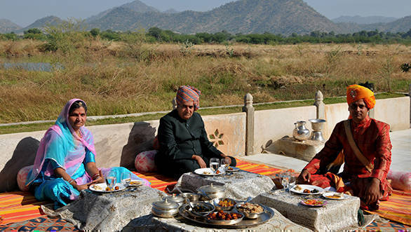 Rao Maharaj Singhji of Jojawar, his wife, and son Kunwar Amitvikram Singh having an alfresco 'regal repast' at Kesar Bagh (Image courtesy: Dinesh Shukla)