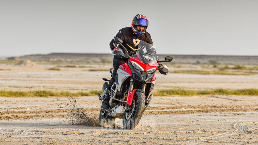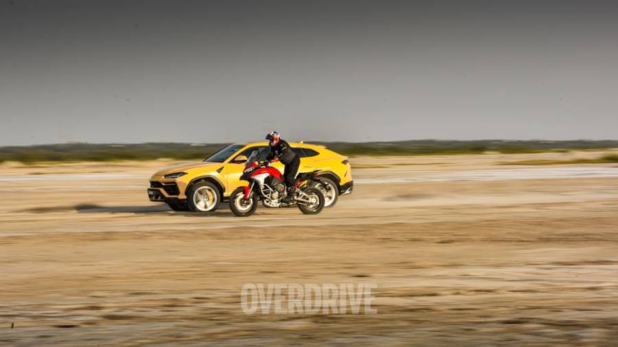From the moment I saw the Urus being lowered from the flatbed to the sand clouds it kicked up on the salt flats, only one thing ran in mind - I'll probably not look as cool on the Multistrada V4. It's to do not with this motorcycle's capacities, but mine. Sliding this beast of a Ducati on the salt, or ploughing through the powered sand with its tarmac biased tyres wasn't going to be easy. But Ducati like its siblings at Lamborghini, have mastered the witchcraft that is the new-age electronics. The Urus' torque vectoring is quite sophisticated, yes, but Ducati's job seems much harder - put the power down only to one wheel and still catapult the motorcycle from standstill to a tonne in under four seconds, irrespective of the terrain.