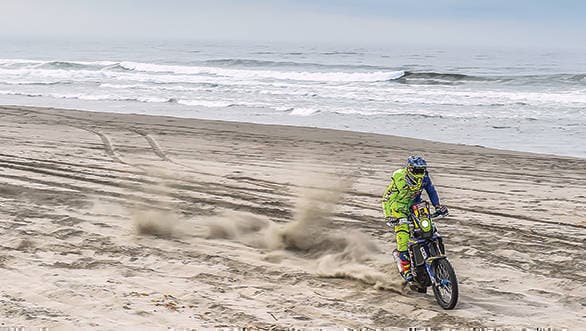 The Dakar bivouac is a place of intense activity. It's full of things happening. The brave competitors in the Originals or Malle Moto class are busy tinkering with their own motorcycles. Elsewhere mechanics are hosing down their rally bikes, team physios are checking to see where their riders might have injured themselves, and the riders themselves are usually doubled up, brows furrowed, poring over those roadbooks. It's almost impossible to get hold of anyone to talk to. Which is why when we catch sight of Aravind sauntering towards the showers, we ambush him at once. "The surface was looser than we thought it would be, so it was tough," Aravind says of the second stage. "And thanks to Peru, the surface is loose to begin with!" he says. The terrain makes riding very, very difficult. And it doesn't help that when the cars run before the motorcycles, the tracks get dug up rather a lot. Then there's the fact that the dunes are disorienting. As Aravind says, "They make it harder and harder for us. You've got no reference point, so without the WPM, WPS and WPC (the waypoints) we'd be completely lost."