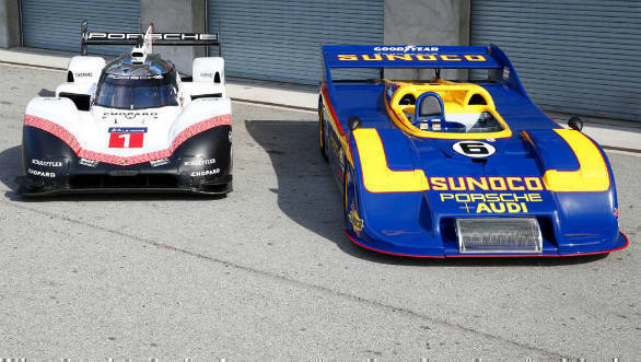 The ultimate 917, the 917/30 for the Can Am series. Seen here alongside the spiritual successor, the Porsche 919 Hybrid Evo