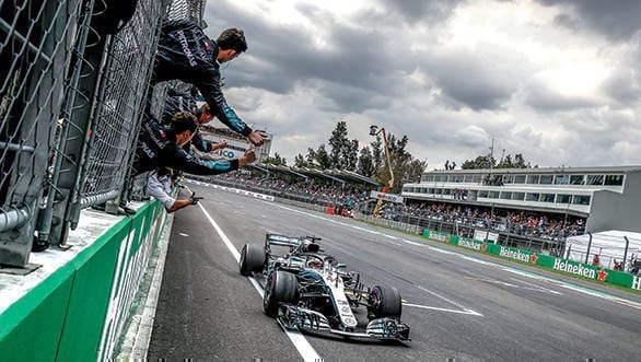 Crossing the chequered flag in fourth place at Mexico, Hamilton's Mercedes team celebrates, knowing that he's claimed the 2018 championship title