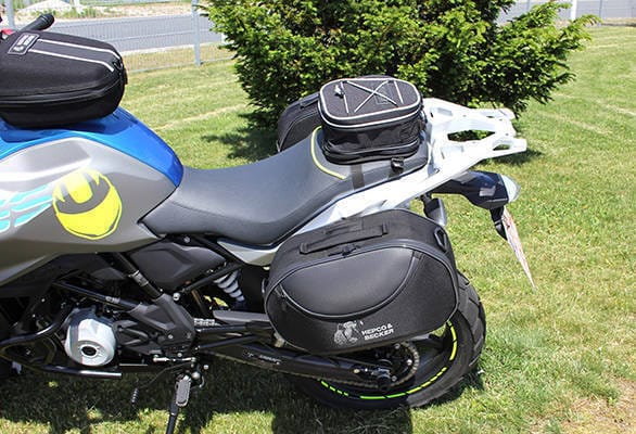 The first thing you will notice about the Hornig-customised BMW G 310 GS is the metallic blue paint and neon yellow accents. These accents, also found on the seat and wheel rims, aid visibility. The Hornig kit increases storage space by added a tank bag and panniers which are installed on a special mounting kit, along with a rack-mounted tail bag. Enlargers for the brake pedal and the side stand base will increase ease of use for the G 310 GS off the road.