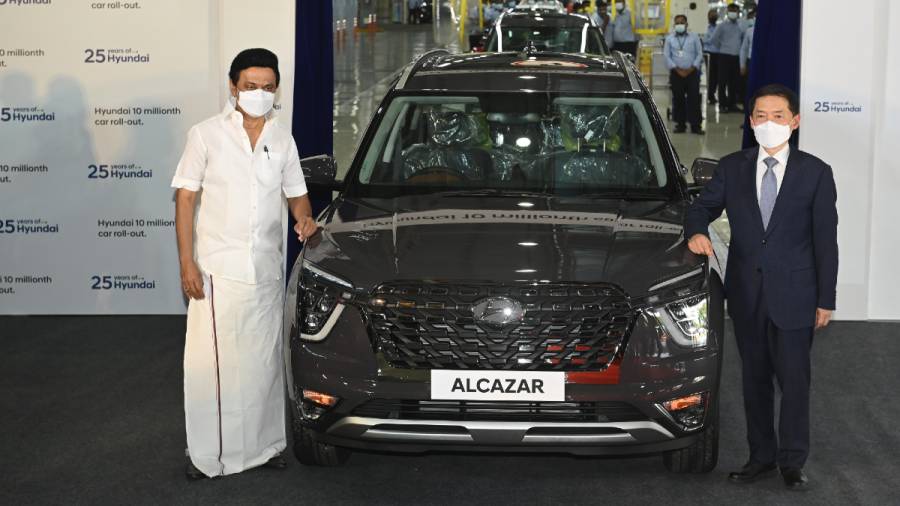 Hyundai Motor India has now produced over 10 million cars in India. Having begun operations with the Santro 25 years ago, the Korean carmaker has been the fastest to reach this milestone in India. The 10 millionth car to roll out of Hyundai's Sriperumbudur plant was a Hyundai Alcazar, the three-row derivative of the Creta and its latest offering in India.