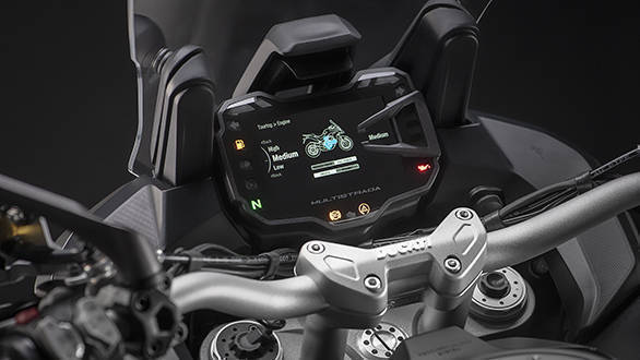The rider can connect his/her smartphone and access music/calls via Ducati's application with controls on the left switchgear.