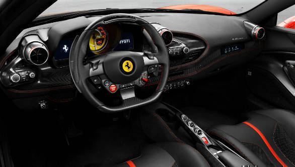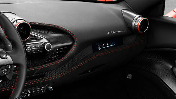 The F8 Tributo sports a seven-inch touch screen on the passenger side of the dashboard