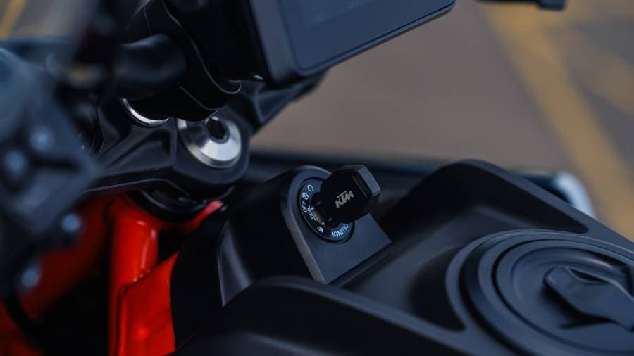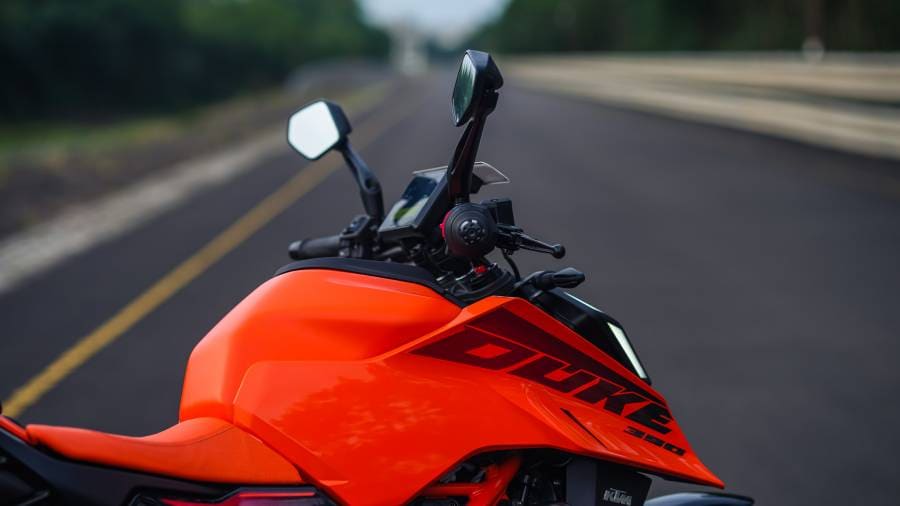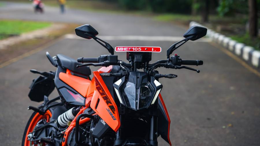 Before going to the picture gallery of the new-gen 390 Duke, here are some key features and specifications highlights: a five-inch colour TFT display with Bluetooth connectivity, ride-by-wire, three ride modes (Street, Rain, and Track), a slipper clutch, dual-channel ABS with cornering ABS, a quick-shifter, and launch control. In terms of hardware, the motorcycle gets WP Apex open cartridge upside-down front forks with compression and rebound adjustability, a WP Apex offset rear mono-shock with preload and five-step rebound adjustability, a single 320mm front disc brake paired with a four-piston radial fixed calliper, and a single 240mm rear disc brake with a two-piston floating calliper.
