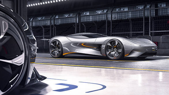 Jaguar Vision Gran Turismo is a virtual all-electric racecar developed for the game 'Gran Turismo Sport'. Jaguar has taken inspiration from its C-type and D-type for the design while its underpinnings have been borrowed from Jaguar's I-TYPE 4 Formula E and I-PACE eTROPHY racing cars.