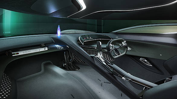 The cockpit has been wrapped around the driver, reminiscent of the Jaguar D-type. Surrounding the cockpit is a glass that highlights the danger through the car's user interface. The Vision GT also gets an artificial intelligence called 'KITT-E'. KITT-E will let the driver know the essential information of the car and race through various visual and audio format.