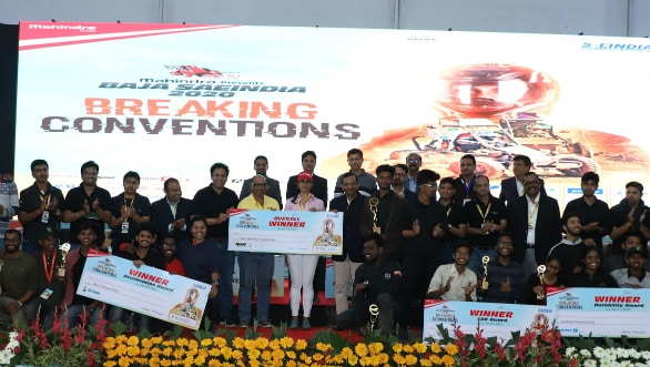 The Team Predators from DY Patil College of Engineering, Akurdi, Pune won the mBAJA title. The eBaja winners were Team E-Ziba Racers from Shri Vishnu Engineering College for Women, Andhra Pradesh. Team Aryans from Government College of Engineering, Aurangabad, Maharashtra and Team SparkX Racing from Silver Oak College of Engineering & Technology, Ahmedabad, Gujarat took second and third place respectively in mBAJA. The second spot in the eBaja competition went to Team Acrostreak from Acropolis Institute of Technology & Research, Indore.