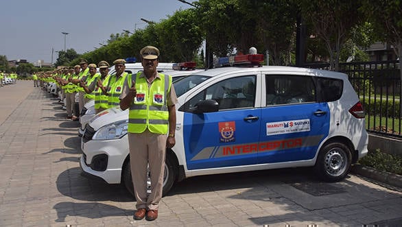 The Maruti Suzuki vehicles given to the Haryana police come equipped with a beacon light, siren, public address system and police stickers. The Maruti Suzuki Ertiga cars have interceptors equipped with laser-based traffic speed video systems, printers, roof-mounted day and night all-weather PTZ cameras, LED monitor roof light bars and public address mechanisms. The interceptors are also fitted with breath alcohol analysers to detect drink and drive cases. Additionally, the Maruti Eeco ambulances have been equipped with the necessary first aid devices.