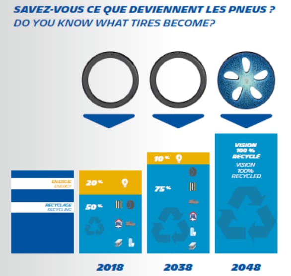 At present, just 50 percent of the tyres being used are recycled. Michelin hopes to increase this to 80 per cent by 2048. In that time, it also hopes to be able to recover all of the tires it sells to customers. Michelin is also investing in high technology recycling so that by 2048 tyres are 100 percent recyclable. The company estimates these efforts will save the equivalent of 33 million barrels of oil per year.