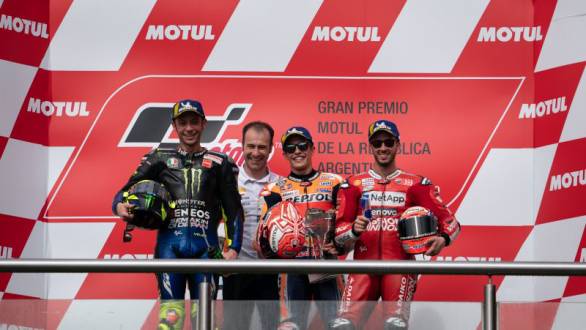 Repsol Honda's Marc Marquez took a dominant victory in Argentina, crossing the chequered flag over nine seconds ahead of his nearest rivals during the race. Second place in the race went to Valentino Rossi, who got the better of Andrea Dovizioso, with the Ducati rider having to settle for the final step of the podium.