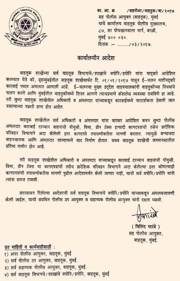 The e-challan system was implemented to remove irregularities and bribery from the operations of the Mumbai Traffic Police department. The order to stop checking for documents was issued to the Additional Commissioner of Police (Traffic), the three DCPs in the traffic department, Assistant Commissioners, Senior Police Inspectors and inspectors of all the traffic branches on 10 March, 2017.
