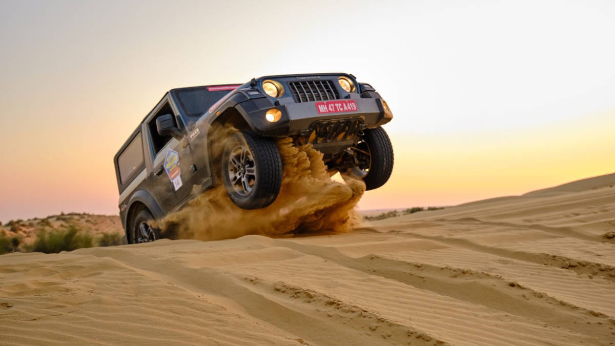 The new Thar is based on Mahindra's Gen3 platform and sits on independent double-wishbone front suspension with a stabilizer bar and multilink coil spring rear suspension. There is a serious four-wheel-drive system with a transfer case, a mechanical locking rear differential and brake locking differentials on the front and rear axles. Mahindra says that the unladen ground clearance is 226mm when specified with the optional 18-inch tyres. These 255/65 R18 tyres have a 798mm diameter. Standard tyre size on steel rims is 245/75 R16. The Thar has an impressive 41.8? approach angle, 36.8? departure angle and 27? break over angle when specified with the larger tyres. Maximum water wading depth is 650 mm. Read about the time we took the new Thar dune-bashing here.