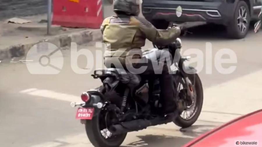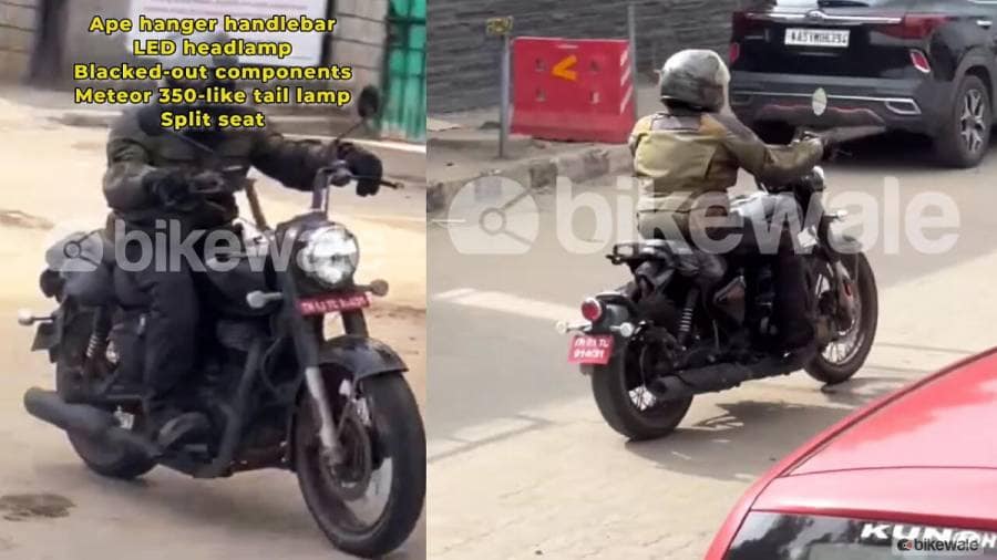 The latest spy pictures show some distinct design elements on the recently spotted Bobber 350, including whitish strips on the rims. Notably, the motorcycle features a new LED headlamp, LED indicators, and a Meteor 350-inspired LED taillight. Additional highlights include a bobber-style slash-cut exhaust, a tyre hugger, and a tallboy handlebar.