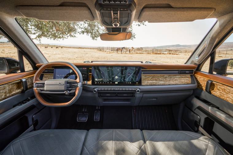 The cabin gets Terracotta leather wrapping around the beltline, burlap-inspired headliner fabric, weathered hemp-wood, plaid interiors, wooden inlays on the dashboard and doors, a digital instrument cluster, horizontal and sleek air vents, ambient lighting, physical rotary knobs and buttons for HVAC and other functions, a sizeable infotainment unit, a two-spoke steering multi-functional steering wheel to name a few. The infotainment unit runs the Scout Community UX that lets the co-passenger take control of the screen.
