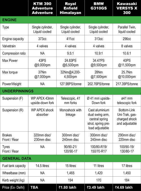 Spec Comparo: KTM 390 Adventure vs Royal Enfield Himalayan vs BMW G 310 GS vs Kawasaki Versys-X 300