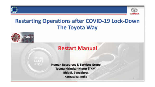 Masakazu Yoshimura, managing director of Toyota Kirloskar Motor said of this initiative, "Today, the COVID-19 pandemic has affected the health and safety of people across the globe. We are witnessing demand, supply, market and liquidity shocks, decline in real GDP growth rates, and so many setbacks. It's our prime responsibility to ensure health and safety of employees, families and all our stakeholders. We need to safeguard business continuity and economic recovery as well by ensuring 'Safety & health First' approach. In this perspective, this 'Restart Manual' is prepared not only for our use but also for the benefit of government, industries and stakeholders. I would like to congratulate our TPS (Toyota Production System) experts who have worked hard to create this manual."