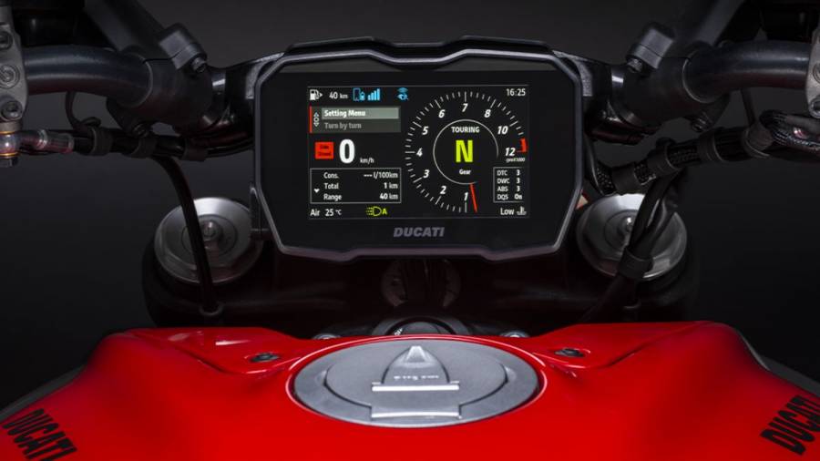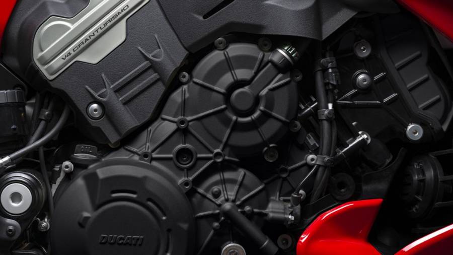 This 1,158cc 168PS Granturismo V4 is the new-found definition of tractability for Ducati, able to deliver peak power at 10,750rpm and peak torque (a gargantuan 126Nm) at 7,500 rpm. So it's up by around 6PS over the Diavel 1260, albeit making close to 3Nm less. Now we've already seen what the engine can do with the Mutistrada V4 and it's a real doozy, this one good power low down the band, with heaps of fun the higher you climb u the rev band. Also, the engine can switch off the two rear cylinders to reduce fuel consumption and prevent the frying your human parts just like on the Multi V4.