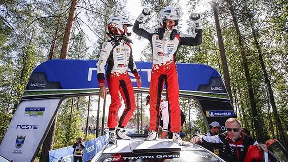 Tanak and Martin Jarveoja celebrate the win at Rally Finland