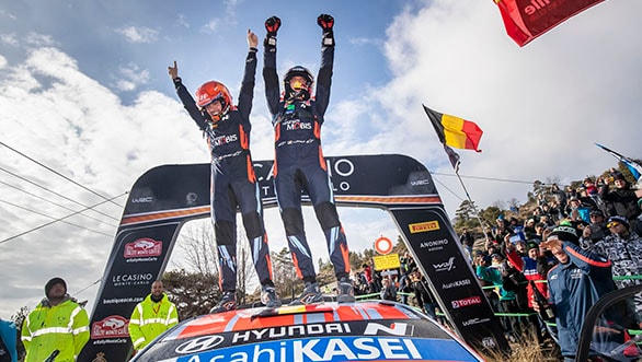 Thierry Neuville and Nicolas Gilsoul celebrate their win at the 2020 WRC Rally Monte Carlo