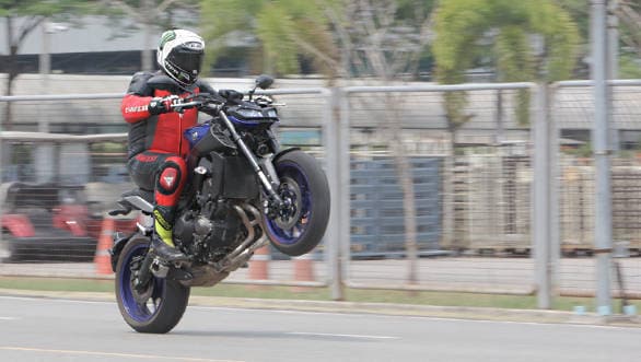 And tipping the scales at 193kg wet, the MT-09 is not too heavy. In fact it feels surprisingly light and nimble on the go. Despite the limited time in its saddle and the diminutive size of the test track it was easy to see why the MT-09 is a huge hit internationally. Throttle response is instant and fueling precise, while refinement levels are top notch be it the engine or the six-speed gearbox which makes for a very premium feel. But what impressed me the most was the fact that while ridiculously easy to ride even for a novice, the MT-09 is also quick to turn into an absolute hooligan. The MT-09 loves wheelies, power slides and stoppies. It's almost as if the bike was always meant to be a stunt machine! Lots of bottom end torque means the front wheel comes up at the drop of a hat and the MT-09 makes wheelies ridiculously easy with its kind of performance and chassis balance. Needless to say, the chassis and suspension also make the bike easy to tip into corners.
