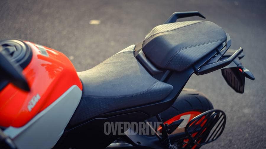 The WP big-piston fork up front is a real boon to have on here and you feel well informed and in control through it all, even though it isn't adjustable like on the 390 Duke. The pre-load adjustable offset monoshock gives the rear of the 250 Duke a good mix of absorption and stiffness. Like with the 390 Duke, the seat out here gives you a good amount of room to move about and find the right spot, but the longer you're saddled in, the more you'll crave a seat with higher foam density.