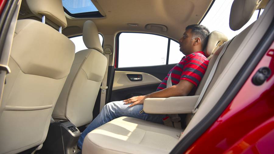 The Dzire continues with the same 2,450mm wheelbase as before but feels more spacious in the back seat. Maruti Suzuki has reworked the seat contours, which combined with the light interiors, more open windows and the big new addition of a sunroof, seem to help with this sense. The three-box design also helps free up more space than in the current Swift.