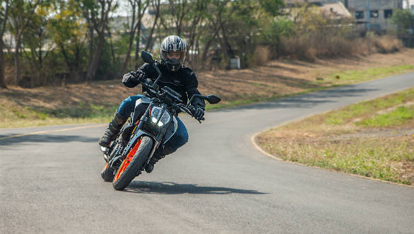 Leaning from left to right is as quick as you exit a corner on the 390 Duke, while you are at the apex just blip the throttle and the instant torque will take care of the rest. There is power across the rev band which makes the bike exciting and a bit dangerous at the same time. A power surge can be caused at a flick of the wrist, you don't even have to shift down. If the quickshifter works then you can shift down while you enter the corner without losing power.