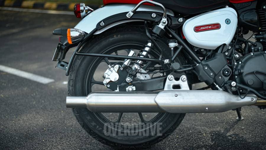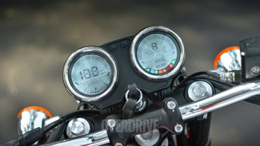Design-wise, the SRC 500 sports a timeless classic retro design with its 90-degree upright engine, the rounded halogen lighting at both ends, twin pod meters, wide handlebar with round steel-finish mirrors, vintage fuel tank, the classic peashooter exhaust and a flat bench seat. If you go to the QJ Motor website right now, you'll see that the SRC 500 bike pictured there comes with 19/18- inch spoke wheels and all-analogue meters which just piles on the old-school charm for me, but we'll have to settle for the alloys (same size) and the all-digital instrumentation out here, because we don't have that option. In terms of features, the bike is quite Spartan considering its steep Rs 2.79 lakh (ex-showroom) asking price.