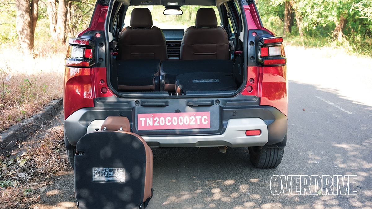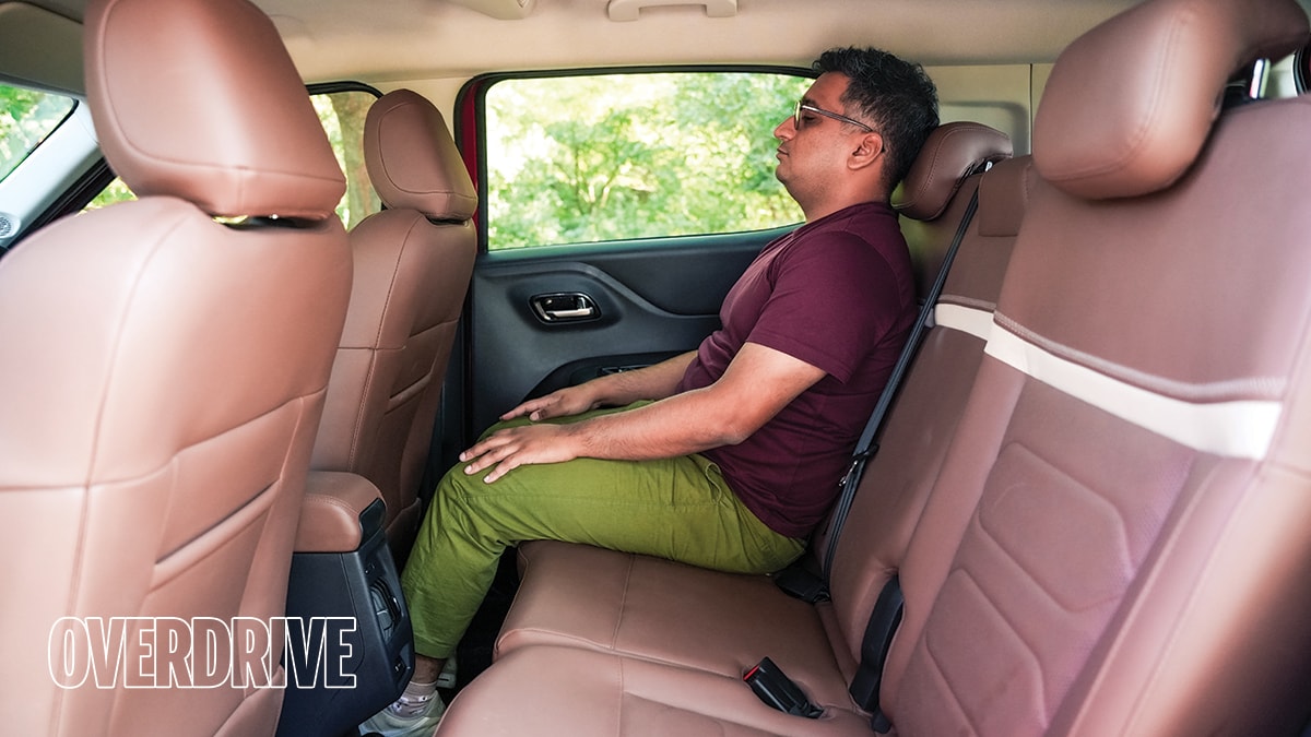 Now, this top-end variant of the Aircross X comes in a seven-seat configuration, but in effect this is best described as a 5+2 configuration. Getting in is not too difficult if you are of average height, but once inside, you'll realize that the space is best for children. There is not much space to put your legs, and the rear seat base is quite short, as in many three-row cars. But you seem to sit right below the rear structural panels, so headroom is tight and you can't fully sit up straight. The small quarter glass will make adults feel fairly hemmed in too. You do get chargers and bottle holders here though.